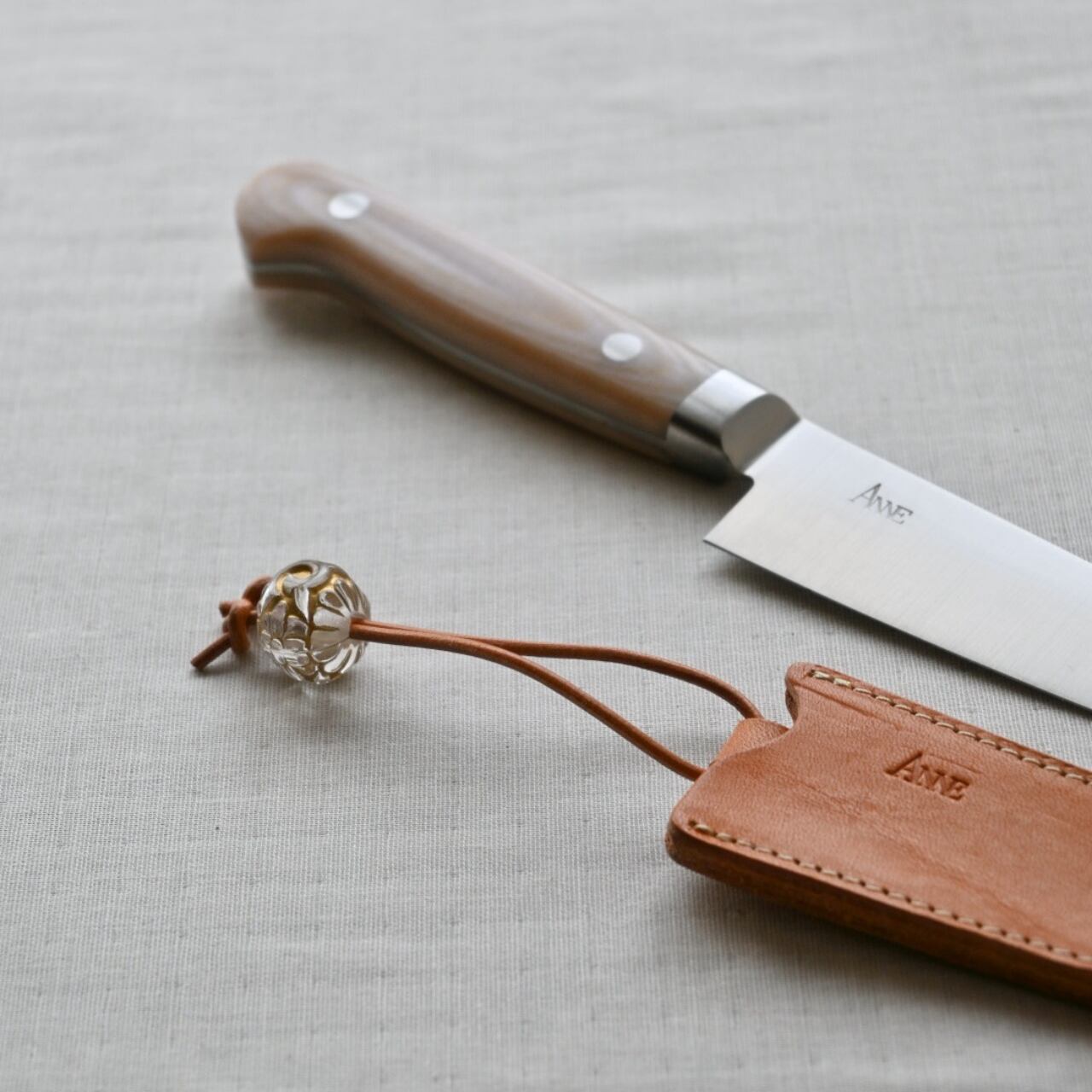 柄の部分は麻布を何層にも重ねて樹脂で固めたスペインのリネンマイカルタを使用しています。経年変化による変色や伸び縮みが少なく、衝撃にも強いのが特長です。麻布の柔かな風合いが優しい雰囲気を醸し出します。